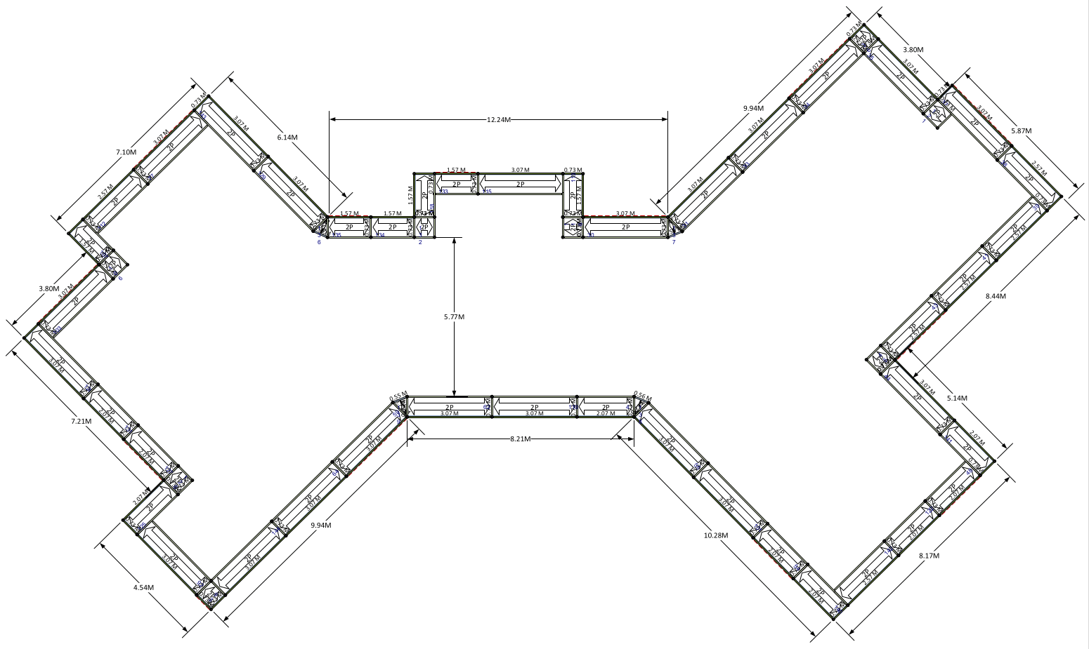 118.79m Total Length (Scaffold A: 62.15m; Scaffold B: 56.64m) x 0.73m Deep x 5m High